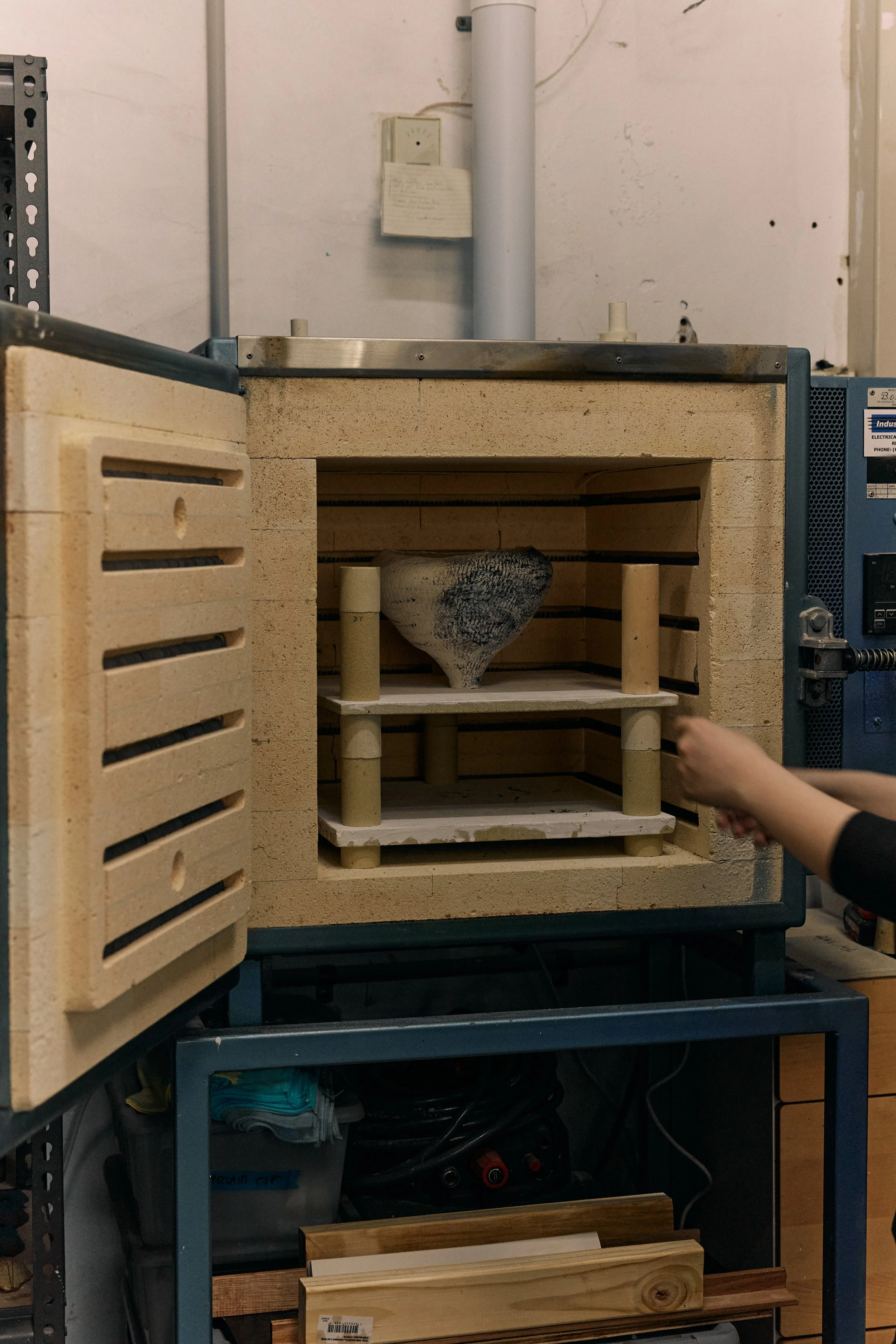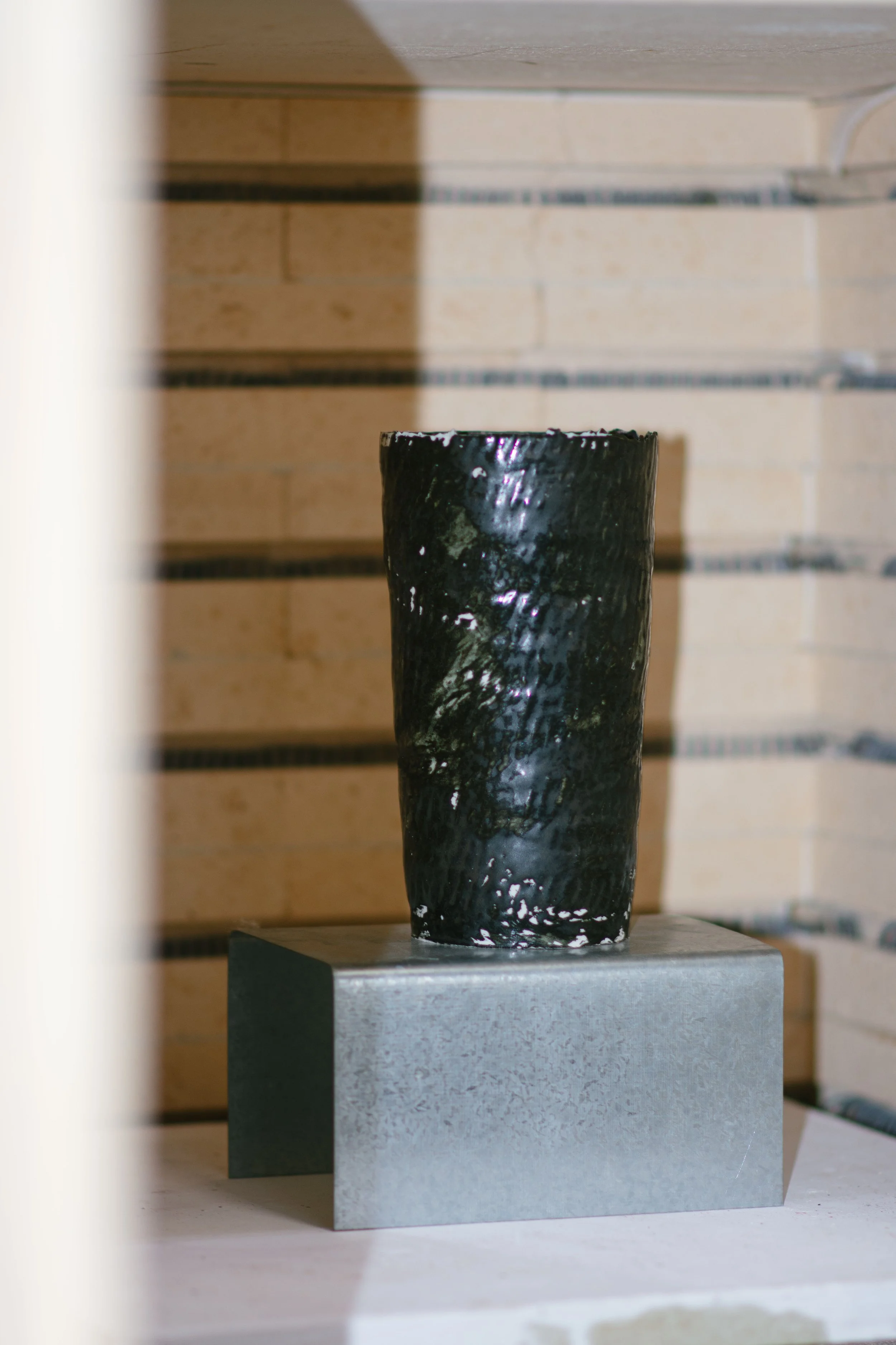 The structure materialises over days, using traditional coiling techniques rendered contemporary through the use of excessively thin, pinched coils. The surface is slowly composed, with layers of oxides and glazes brushed or stamped into place.