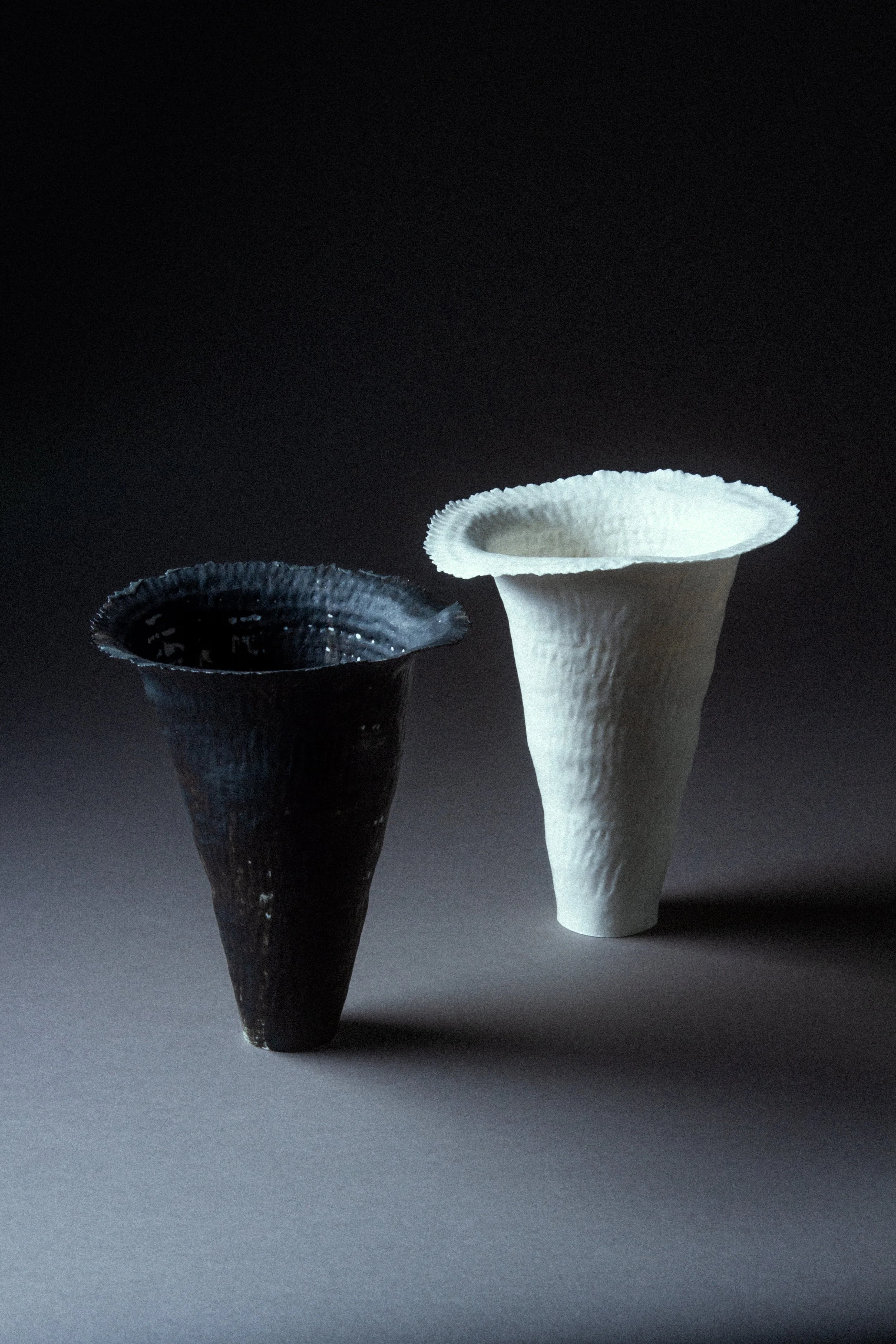 The chipped tableware is reimagined through a meticulous arrangement of fine coils, light in weight—a contrast of the sturdy, thrown tableware.