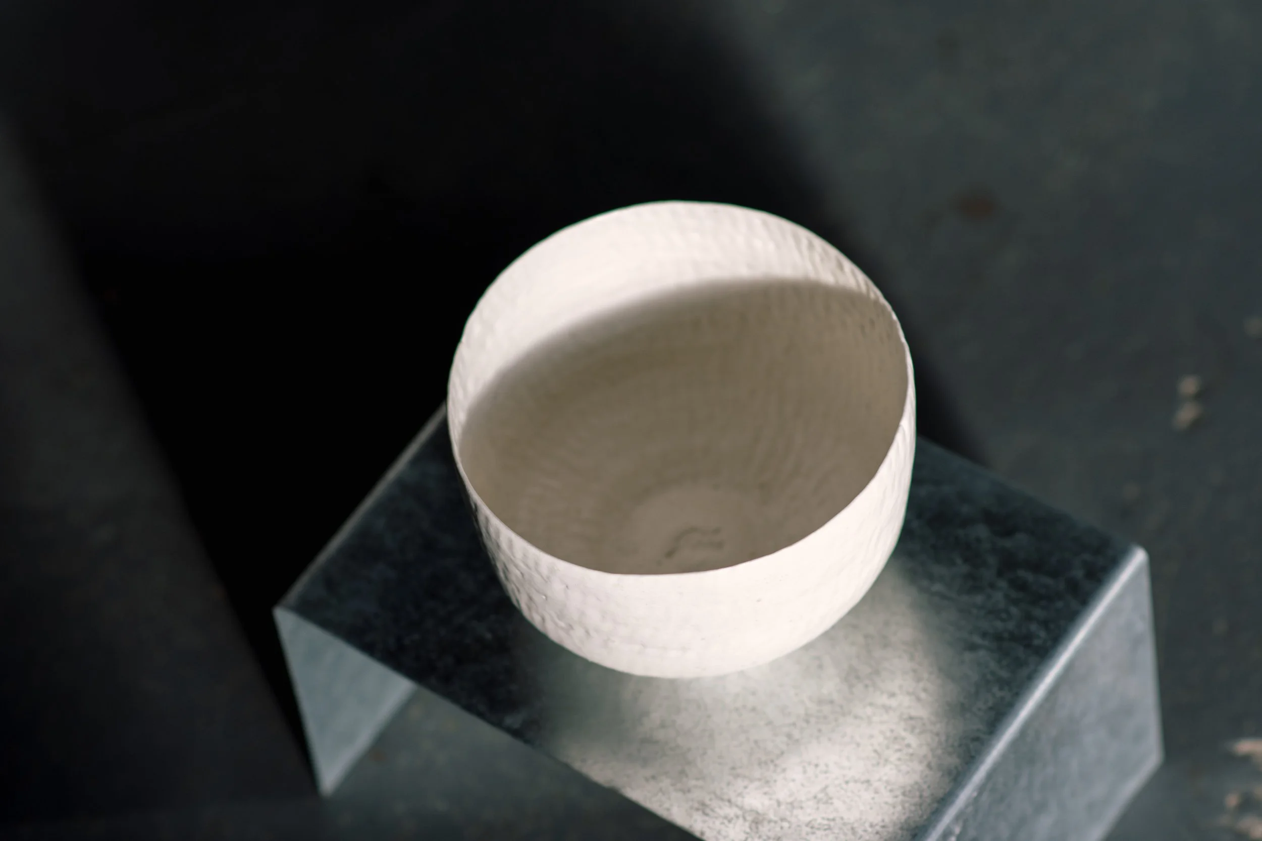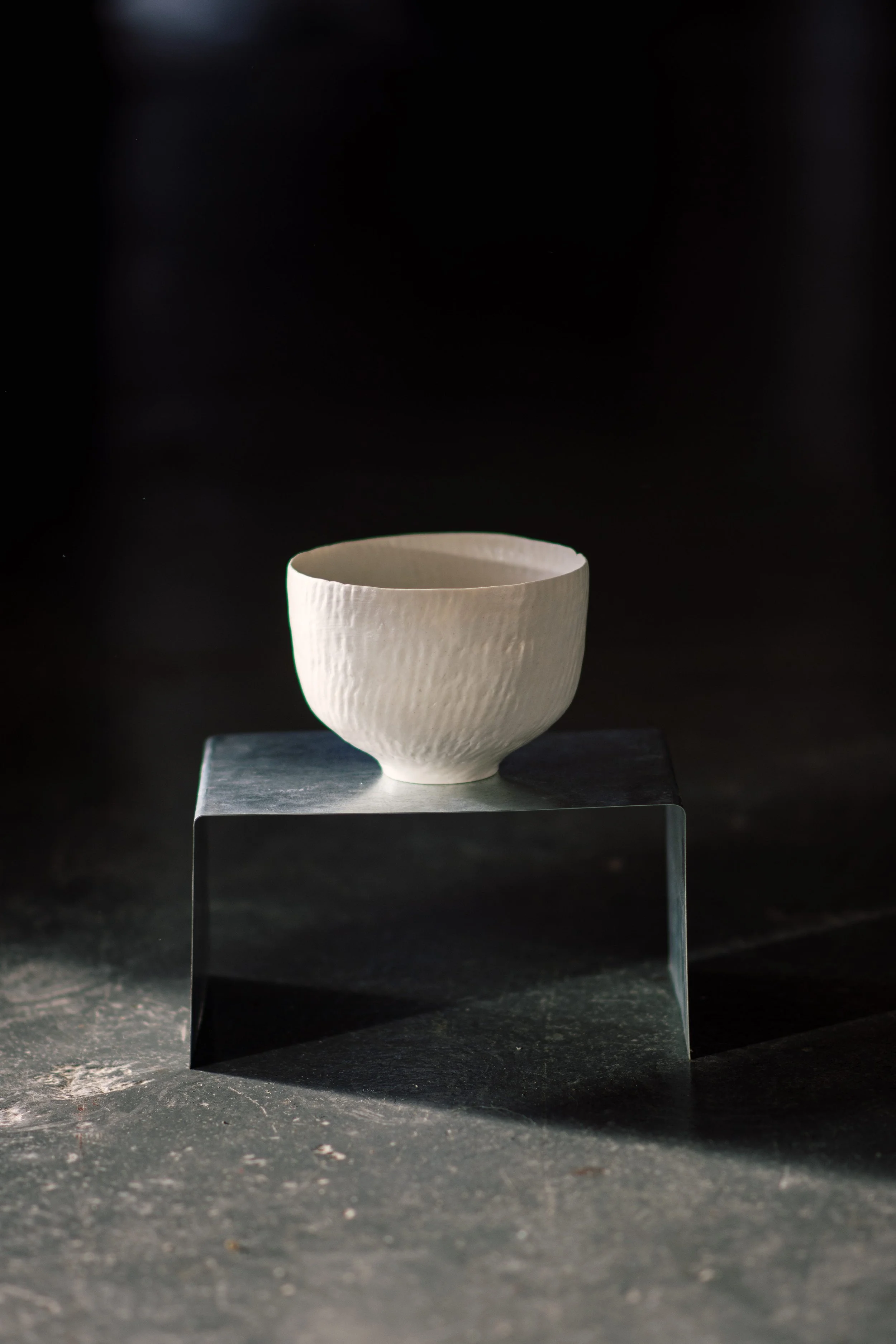 The surface finish is a cool, bright white with a matte texture and a subtle translucency of high-fired porcelain. When placed under direct light, you can see through the coils and the thinner areas of the form will reveal a soft glow.